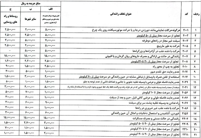 وی درباره جزئیات مبالغ تخلفات رانندگی افزود: افزایش جریمه برخی تخلفات در نوروز ۱۴۰۴ از ۲۰ اسفند ۱۴۰۳ تا ۲۰ فروردین ۱۴۰۴ برای مبلغ جریمه ۲۱ کد تخلف در جادههای برونشهری، به استثنای وسایل نقلیه عمومی، با یکسوم افزایش محاسبه خواهد شد.