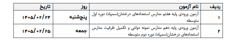 ثبتنام آزمون ورودی پایه هفتم سازمان ملی پرورش استعدادهای درخشان (سمپاد) در دوره اول متوسطه، آزمون ورودی پایه دهم مدارس نمونه دولتی و همچنین تکمیل ظرفیت مدارس سمپاد در دوره دوم متوسطه، از تاریخ ۱۴۰۴/۱۲/۱۳ آغاز و در روز دوشنبه ۱۴۰۴/۱۲/۱۸ پایان میپذیرد.