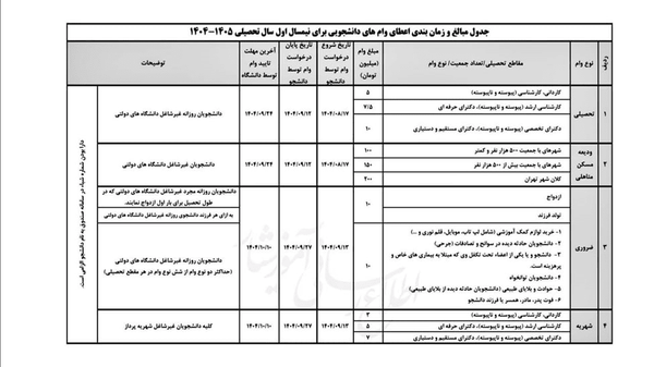 مبالغ وام شهریه برای نیمسال جاری به این صورت اعلام شده است که دانشجویان مقاطع کاردانی و کارشناسی پیوسته و ناپیوسته میتوانند از وام ۳ میلیون تومانی استفاده کنند. برای مقاطع کارشناسی ارشد پیوسته و ناپیوسته و دکتری حرفهای مبلغ ۵ میلیون تومان تعیین شده و دانشجویان دکتری تخصصی، دکتری مستقیم و دورههای دستیاری نیز امکان دریافت وام ۷ میلیون تومانی را دارند.