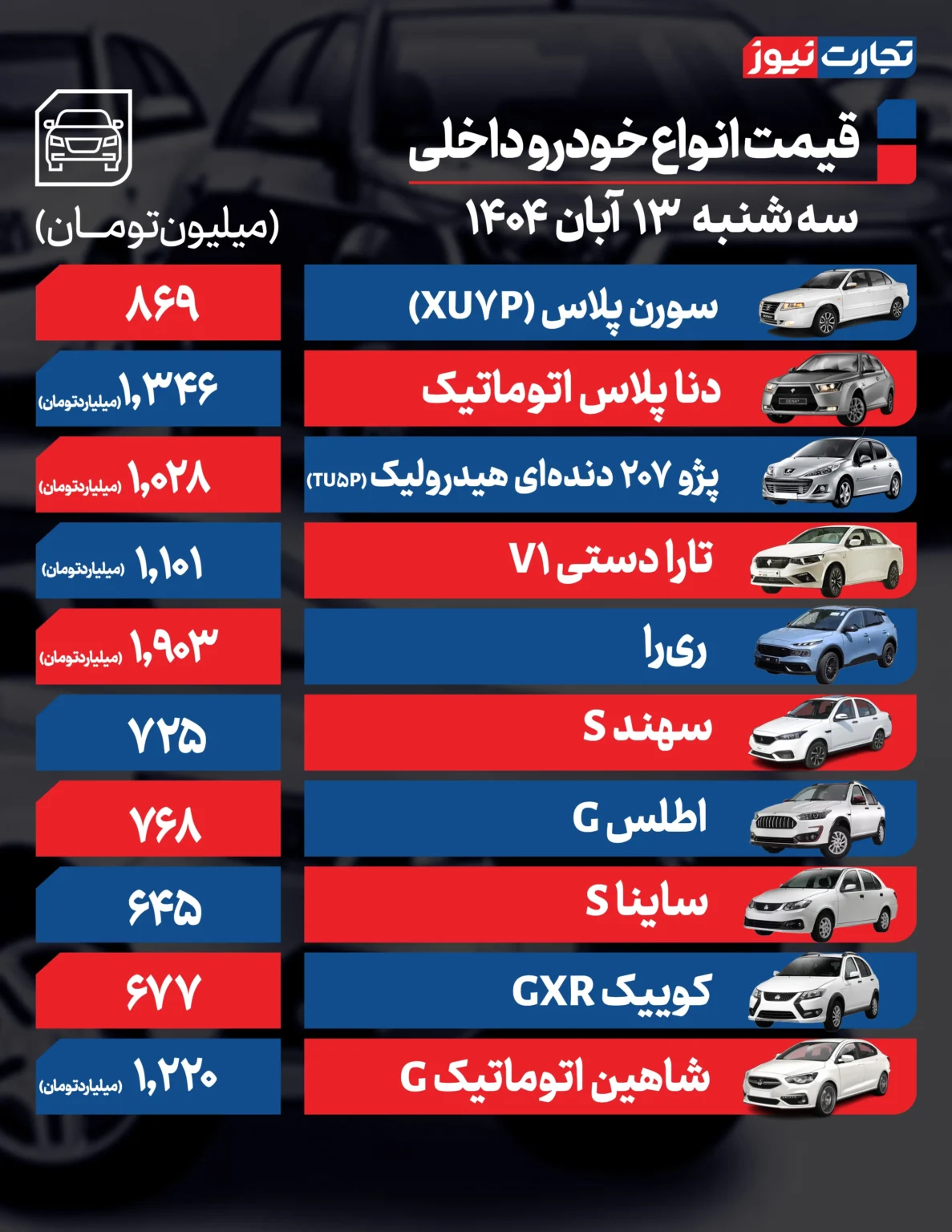 جدیدترین قیمت خودروهای داخلی و خارجی امروز سه‌شنبه ۱۳ آبان ۱۴۰۴